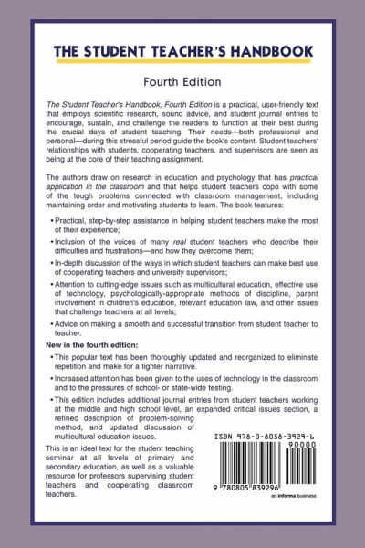 The Student Teacher's Handbook, Fourth Edition is a practical, user-friendly text that employs scientific research, sound advice, and student journal entries to encourage, sustain, and challenge the readers to function at their best during the crucial days of student teaching. Their needs--both professional and personal--during this stressful period guide the book's content. Student teachers' relationships--with students, cooperating teachers, and supervisors--are seen as being at the core of their teaching assignment. The authors draw on research in education and psychology that has practical application in the classroom and that helps student teachers cope with some of the tough problems connected with classroom management, including maintaining order and motivating students to learn. The book features: *practical, step-by-step assistance in helping student teachers make the most of their experience; *inclusion of the voices of many real student teachers who describe their difficulties and frustration--and how they overcome them; *in-depth discussion of the ways in which student teachers can make best use of cooperating teachers and university supervisors; *advice on making a smooth and successful transition from student teacher to teacher; and *attention to cutting-edge issues, such as multicultural education, effective use of technology, psychologically-appropriate methods of discipline, parent involvement in children's education, relevant education law, and other issues that challenge teachers at all levels. New in the fourth edition: *This popular text has been thoroughly updated and reorganized to eliminate repetition and make for a tighter narrative. *Increased attention has been given to the uses of technology in the classroom and to the pressures of school- or state-wide testing. *This edition includes additional journal entries from student teachers working at the middle and high school level, an expanded critical issues section, a refined description of problem-solving methods, and an updated discussion of multicultural education issues. This is an ideal text for the student teaching seminar at all levels of primary and secondary education, as well as a valuable resource for professors supervising student teachers and cooperating classroom teachers.