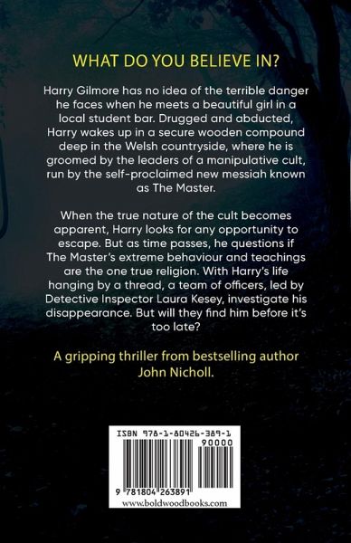 Harry Gilmore has no idea of the terrible danger he faces when he meets a beautiful girl in a local student bar. Drugged and abducted, Harry wakes up in a secure wooden compound deep in the Welsh countryside, where he is groomed by the leaders of a manipulative cult, run by the self-proclaimed new messiah known as The Master. When the true nature of the cult becomes apparent, Harry looks for any opportunity to escape. But as time passes, he questions if the master's extreme behavior and teachings are the one true religion. With Harry's life hanging by a thread, a team of officers, led by Detective Inspector Laura Kesey, investigate his disappearance. But will they find him before it's too late? *Previously published as The Girl in White*