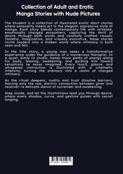 The Student is a collection of illustrated erotic short stories where sensuality meets art in the elegant, expressive style of manga. Each story blends contemporary life with intimate, emotionally charged encounters, capturing the thrill of desire through both words and carefully crafted visuals. Tasteful, imaginative, and visually evocative, these stories invite readers into a hidden world where intimacy is both seen and felt.In the title story, a young man seeks a transformative experience under the guidance of a mysterious therapist. In a quiet, dimly lit studio, hands trace paths of energy along his body, teasing, awakening, and guiding him toward sensations he never imagined. Every touch, glance, and whispered instruction is illustrated with a cinematic intensity, turning the ordinary into a realm of charged intimacy.As the ritual deepens, nudity and trust dissolve barriers, leaving only the raw, electric connection between giver and receiver-a delicate dance of surrender and awakening.Step inside, and let the illustrations lead you through desire, where every shadow, curve, and gesture pulses with secret longing.