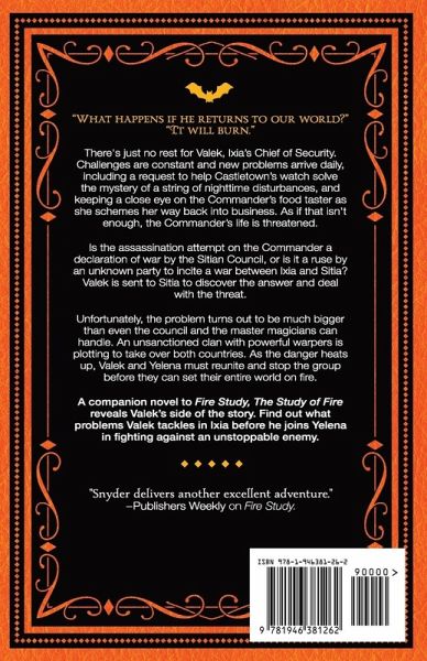 "What happens if he returns to our world?" "It will burn." There's just no rest for Valek, Ixia's Chief of Security. Challenges are constant and new problems arrive daily, including a request to help Castletown's watch solve the mystery of a string of nighttime disturbances, and keeping a close eye on the Commander's food taster as she schemes her way back into business. As if that isn't enough, the Commander's life is threatened. Is the assassination attempt on the Commander a declaration of war by the Sitian Council, or is it a ruse by an unknown party to incite a war between Ixia and Sitia? Valek is sent to Sitia to discover the answer and deal with the threat. Unfortunately, the problem turns out to be much bigger than even the council and the master magicians can handle. An unsanctioned clan with powerful warpers is plotting to take over both countries. As the danger heats up, Valek and Yelena must reunite and stop the group before they can set their entire world on fire. A companion novel to Fire Study, The Study of Fire reveals Valek's side of the story. Find out what problems Valek tackles in Ixia before he joins Yelena in fighting against a unstoppable enemy.