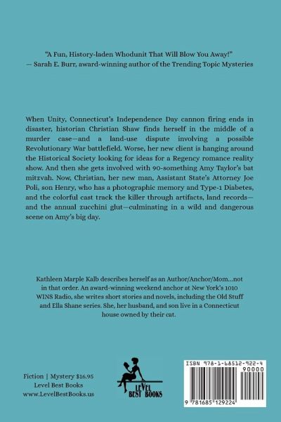 When Unity, Connecticut's Independence Day cannon firing ends in disaster, historian Christian Shaw finds herself in the middle of a murder case-and a land-use dispute involving a possible Revolutionary War battlefield. Worse, her new client is hanging around the Historical Society looking for ideas for a Regency romance reality show. And then she gets involved with 90-something Amy Taylor's bat mitzvah. Now, Christian, her new man, Assistant State's Attorney Joe Poli, son Henry, who has a photographic memory and Type-1 Diabetes, and the colorful cast track the killer through artifacts, land records-and the annual zucchini glut-culminating in a wild and dangerous scene on Amy's big day.