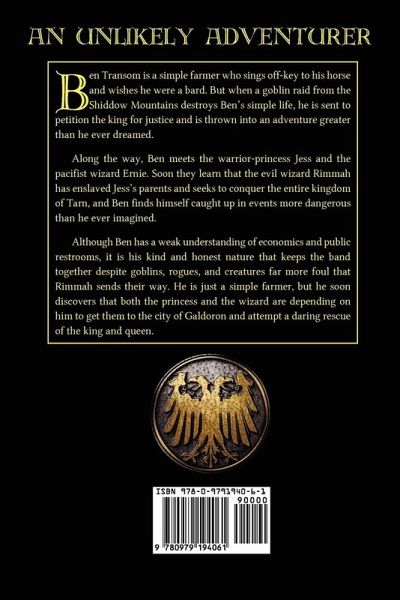 Ben Transom is a simple farmer who sings off-key to his horse and wishes he were a bard. But when a goblin raid from the Shiddow Mountains destroys Ben's simple life, he is sent to petition the king for justice and is thrown into an adventure greater than he ever dreamed. Along the way, Ben meets the warrior-princess Jess and the pacifist wizard Ernie. Soon they learn that the evil wizard Rimmah has enslaved Jess's parents and seeks to conquer the entire kingdom of Tarn, and Ben finds himself caught up in events more dangerous than he ever imagined. Although Ben has a weak understanding of economics and public restrooms, it is his kind and honest nature that keeps the band together despite goblins, rogues, and creatures far more foul that Rimmah sends their way. He is just a simple farmer, but he soon discovers that both the princess and the wizard are depending on him to get them to the city of Galdoron and attempt a daring rescue of the king and queen.