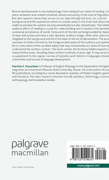 Introduction 1. Prolegomena to Stylistic Timbrology: Automation and Foregrounding 2. Neutrality in Language - Neutrality in Speech 3. Classification of Contexts by Types of Stylistic Background 4. A Glimpse of the Brain: The Mechanism of Mental Audition 5. Inner and Outer Speech: A Parametric Match 6. Individual Author's Style: The Way to Hear Timbre 7. The Style and Timbre of Everyday Speech 8. The Style and Timbre of Official Documents 9. The Timbre of Journalism 10. The Voices in Fiction Conclusion