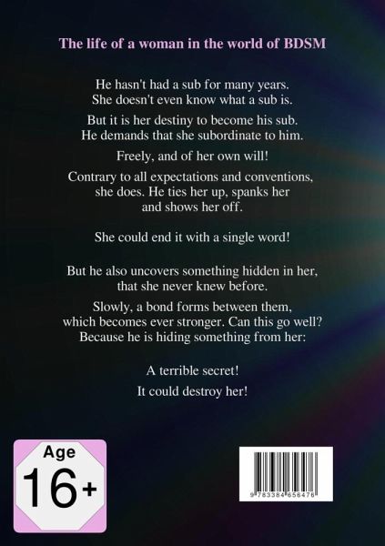 A frivolous and captivating story! Heartbreaking and exciting, humorous and erotic, but also tragic! The meeting of two people against the background of the BDSM world. It will change the fate of both of them forever. She, a young woman, can't understand why the sight of BDSM practices excites her so much. He, an older man, used to practice BDSM but hasn't had a sub for years. She wants to learn from him. He, who becomes her master, wants to grind her, his sub, into his jewel. But then it becomes so much more. Both seem to have finally found what they have been longing for. And the bond between them grows ever closer! But what his lessons uncover in her exceeds all his expectations! And that becomes a problem! Because he has a dark secret that could cost her her life! But he doesn't want to lose her. Ultimately, however, they both have to pay the price for the decisions they make!