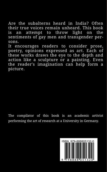 Are the subalterns heard in India ? Often their true voices remain unheard. This book is an attempt to throw light on the sentiments of gay men and transgender persons. It encourages readers to consider prose, poetry, opinions expressed as art. Each of these works draws the eye to the depth and action like a sculpture or a painting. Even the reader's imagination can help form a picture.