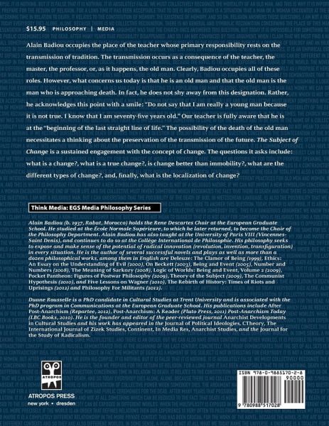 Alain Badiou occupies the place of the teacher whose primary responsibility rests on the transmission of tradition. The transmission occurs as a consequence of the teacher, the master, the professor, or, as it happens, the old man. Clearly, Badiou occupies all of these roles. However, what concerns us today is that he is an old man and that the old man is the man who is approaching death. In fact, he does not shy away from this designation. Rather, he acknowledges this point with a smile: "Do not say that I am really a young man because it is not true. I know that I am seventy-five years old." Our teacher is fully aware that he is at the "beginning of the last straight line of life." The possibility of the death of the old man necessitates a thinking about the preservation of the transmission of the future. The Subject of Change is a sustained engagement with the concept of change. The questions it asks include: what is a change?, what is a true change?, is change better than immobility?, what are the different types of change?, and, finally, what is the localization of change?