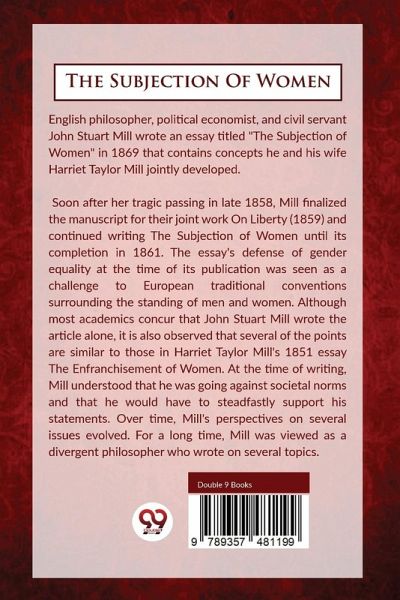 English philosopher, political economist, and civil servant John Stuart Mill wrote an essay titled "The Subjection of Women" in 1869 that contains concepts he and his wife Harriet Taylor Mill jointly developed. Soon after her tragic passing in late 1858, Mill finalized the manuscript for their joint work On Liberty (1859) and continued writing The Subjection of Women until its completion in 1861. The essay's defense of gender equality at the time of its publication was seen as a challenge to European traditional conventions surrounding the standing of men and women. Although most academics…mehr