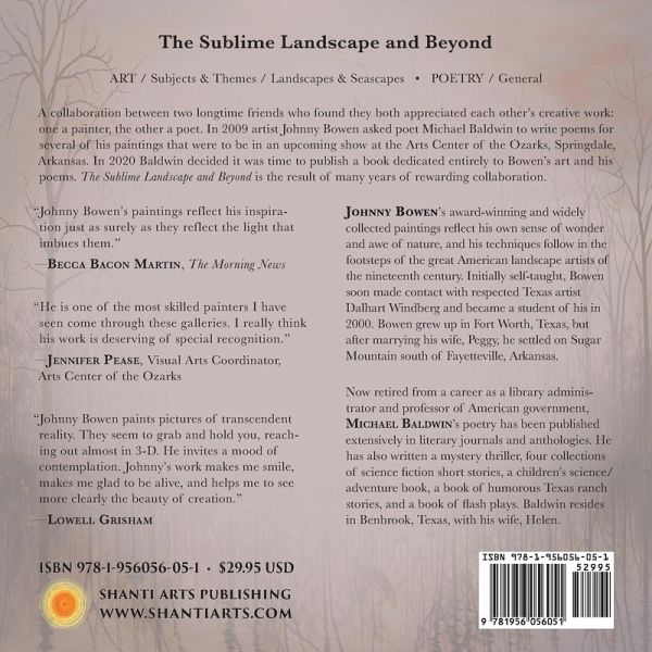 A collaboration between two longtime friends who found they both appreciated each other's creative work: one a painter, the other a poet. Michael Baldwin, an award-winning poet, has, in the past, written poems for artist Johnny Bowen and his family for various occasions. In 2009 Bowen asked Baldwin to write poems for several of his paintings that were to be in an upcoming show at the Arts Center of the Ozarks, Springdale, Arkansas. The project became a labor of love as Baldwin saw the high quality and inspired vision in Bowen's paintings. In 2020 Baldwin decided it was time to publish a book dedicated entirely to Bowen's art and Baldwin's poems. The Sublime Landscape and Beyond is the result of many years of rewarding collaboration.