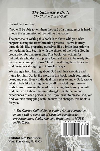 The Submissive Bride The Clarion Call of God* I heard the Lord say, "You will be able to tell them the road of a transgressor is hard." It took the submission of my will to overcome. The purpose of writing this book is to share what happens during the transformation process-as we journey through this life, preparing ourselves as a bride does before her wedding day. So, it is with the church of the living God in preparation for that great day. This book was written for individuals who desire to please God and want to be ready for the second coming of Jesus Christ. It is during these times we find ourselves struggling to know His ways. We struggle between hearing about God and then knowing and living for Him. So, let the words in this book touch your mind, heart, and soul. Every individual that seeks to know God knows what it feels like to struggle to be all that God requires-yet finds himself missing the mark. In reading this book, you will find that we all share the same struggles with the unique experiences of each person's life. If you want to please God yet find yourself struggling with the new life changes, this book is for you. * A clarion call is such a call, coming from the core of one's spirit to move out of complacency, procrastination, doubt, fear, and limitation to MOVE.