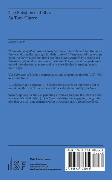 The Substance of Bliss provides an opportunity to sit with Paul and Donna as they wait during the late night for their troubled fifteen-year-old son to come home. As they wait for him they keep their minds occupied by cleaning and discussing potential renovations to the house. The conversation slowly veers toward their decision to marry and have the child that is causing them so much angst.