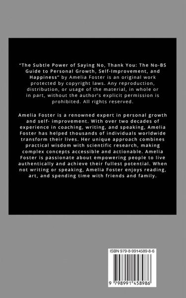 Imagine unlocking the power to transform your life with a simple yet profound act: saying, "No, thank you." "The Subtle Power of Saying No Thank You: The No-BS Guide to Personal Growth, Self-improvement, and Happiness" is your ultimate guide to reclaiming control over your life by mastering the art of saying no. This book will take you on a journey of self-discovery, helping you identify what truly matters to you and equipping you with practical tools to set boundaries, prioritize your well-being, and cultivate a life aligned with your values. In these pages, you will learn how to understand the psychological benefits of saying no, develop a wealth mindset, and adopt effective techniques for assertiveness. You will explore strategies for managing your time, embracing mindfulness, cultivating gratitude, and building resilience. Each chapter offers actionable advice, real-life examples, and practical exercises designed to help you implement these changes in your life immediately. By reading this masterpiece, you will gain the confidence to set and maintain healthy boundaries, reduce stress, and focus on what truly brings you joy and fulfillment. You will discover the power of living authentically and intentionally, leading to a happier, more balanced life. Whether you seek personal growth, better relationships, or a more profound sense of purpose, this book will provide the insights and tools to make meaningful, lasting changes.