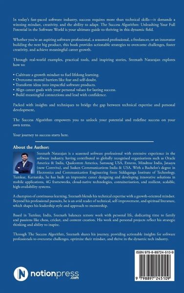 In today's fast-paced software industry, success requires more than technical skills-it demands a winning mindset, creativity, and the ability to adapt. The Success Algorithm: Unleashing Your Full Potential in the Software World is your ultimate guide to thriving in this dynamic field. Whether you're an aspiring software professional, a seasoned professional, a freelancer, or an innovator building the next big product, this book provides actionable strategies to overcome challenges, foster creativity, and achieve meaningful career growth. Through real-world examples, practical tools, and inspiring stories, Sreenath Natarajan explores how to: - Cultivate a growth mindset to fuel lifelong learning. - Overcome mental barriers like fear and self-doubt. - Transform ideas into impactful software products. - Align career goals with your personal values for lasting success. - Build meaningful connections and lead with confidence. Packed with insights and techniques to bridge the gap between technical expertise and personal development, The Success Algorithm empowers you to unlock your potential and redefine success on your own terms. Your journey to success starts here.