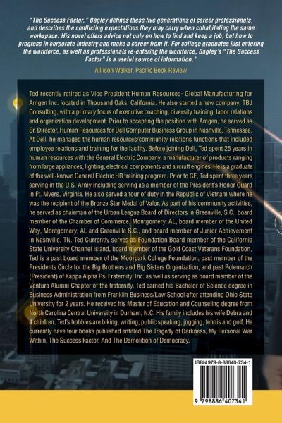 Ted recently retired as Vice President Human Resources- Global Manufacturing for Amgen Inc. located in Thousand Oaks, California. He also started a new company, TBJ Consulting, with a primary focus of executive coaching, diversity training, labor relations and organization development. Prior to accepting the position with Amgen, he served as Sr. Director, Human Resources for Dell Computer Business Group in Nashville, Tennessee. At Dell, he managed the human resources/community relations functions that included employee relations and training for the facility. Before joining Dell, Ted spent 25 years in human resources with the General Electric Company, a manufacturer of products ranging from large appliances, lighting, electrical components and aircraft engines. He is a graduate of the well-known General Electric HR training program. Prior to GE, Ted spent three years serving in the U.S. Army including serving as a member of the President's Honor Guard in Ft. Myers, Virginia. He also served a tour of duty in the Republic of Vietnam where he was the recipient of the Bronze Star Medal of Valor. As part of his community activities, he served as chairman of the Urban League Board of Directors in Greenville, S.C., board member of the Chamber of Commerce, Montgomery, AL, board member of the United Way, Montgomery, AL and Greenville S.C., and board member of Junior Achievement in Nashville, TN. Ted Currently serves as Foundation Board member of the California State University Channel Island, board member of the Gold Coast Veterans Foundation, Ted is a past board member of the Moorpark College Foundation, past member of the Presidents Circle for the Big Brothers and Big Sisters Organization, and past Polemarch (President) of Kappa Alpha Psi Fraternity, Inc. as well as serving as board member of the Ventura Alumni Chapter of the fraternity. Ted earned his Bachelor of Science degree in Business Administration from Franklin Business/Law School after attending Ohio State University for 2 years. He received his Master of Education and Counseling degree from North Carolina Central University in Durham, N.C. His family includes his wife Debra and 4 children. Ted's hobbies are biking, writing, public speaking, jogging, tennis and golf. He currently have four books published entitled The Tragedy of Darkness, My Personal War Within, The Success Factor, and The Demolition of Democracy.