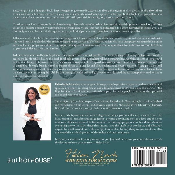 Discover, part I of a three-part book, helps teenagers to grow in self-discovery, in their passions, and in their dreams. It also allows them to deal with low self-esteem, fear, and bullying, and it teaches them to develop a positive self-image. In this book, teenagers will learn to understand different concepts, such as purpose, gift, skill, potential, friendship, job, passion, and much more. Transform, part II of a three-part book, shows teenagers how to be transformed and how to understand the process required to grow from within and become a person who displays character and good values. This part helps teenagers to picture themselves as leaders who take ownership of their choices and who apply concepts and principles that teach them how to become more responsible. Influence, part III of a three-part book, teaches teenagers to influence the world in which they live and to grow in the concept of leadership. The world needs future leaders who understand good values and exemplify character; leaders who serve their people without selfish motives and who love the people around them. In this part, teenagers will learn to change their mindset about how to become successful and how to positively influence their communities. Indeed, teenagers are looking for inspiration; they are looking for something different that will change their self-paradigms and how they see the world. Hopefully, having this book in schools as part of the curriculum will help teenagers become global citizens of tomorrow. I believe that through this books, teachers, parents, and teenagers will be inspired, transformed, and motivated to become better versions of themselves. It would benefit schools to balance theory with practice and allow students to discover themselves. These parts are mixed with inspirational quotes, self-developing topics, and coaching questions to allow teenagers to discover where they are in life and focus on what they want to accomplish. This book is teenager-friendly and will guide teens to understand the action steps they need to take in order to embrace their destinies.