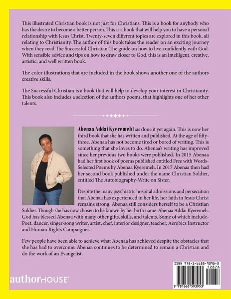 This illustrated Christian book is not just for Christians. This is a book for anybody who has the desire to become a better person. This is a book that will help you to have a personal relationship with Jesus Christ. Thirty different topics in thirty chapters are covered and explored in this book, all relating to Christianity. The author of this book takes the reader on an exciting journey when they read The Successful Christian-The guide on how to live confidently with God. With sensible advice and tips on how to draw closer to God, this is an intelligent, creative, artistic, and well written book. The color illustrations that are included in the book shows another one of the authors creative skills. The Successful Christian is a book that will help to develop your interest in Christianity. This book also includes a selection of the authors poems, that also highlights one of her other talents.