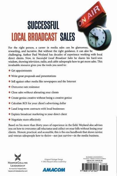 Author Paul Weyland shares his decades of experience working with local direct clients and hard-won wisdom to show television, radio, and cable salespeople how to get more sales. For the right person, a career in media sales can be glamorous, rewarding, and lucrative. But without the right guidance, it can also be challenging. Successful Local Broadcast Sales gives you the tools you need to: get appointments write great proposals and presentations sell against other media like newspapers and the Internet overcome rate resistance close sales without alienating their clients create genius creative without being a creative genius calculate ROI for the client's advertising dollar land long-term contracts with local businesses negotiate more effectively Honest, practical, and accessible, Successful Local Broadcast Sales is the one handbook that shows novice and veteran salespeople how to thrive--not just survive--in the media business.