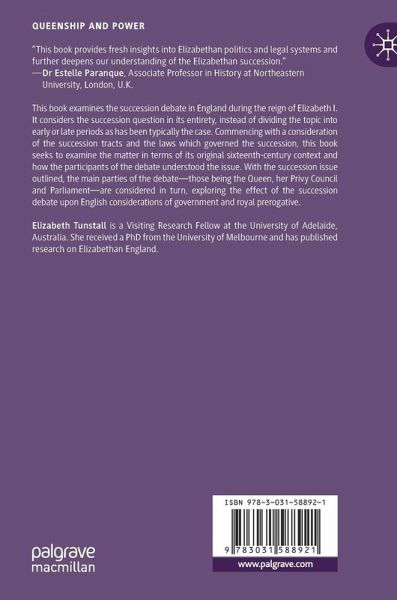 This book examines the succession debate in England during the reign of Elizabeth I. It considers the succession question in its entirety, instead of dividing the topic into early or late periods as has been typically the case. Commencing with a consideration of the succession tracts and the laws which governed the succession, this book seeks to examine the matter in terms of its original sixteenth-century context and how the participants of the debate understood the issue. With the succession issue outlined, the main parties of the debate - those being the Queen, her Privy Council and Parliament - are considered in turn, exploring the effect of the succession debate upon English considerations of government and royal prerogative.