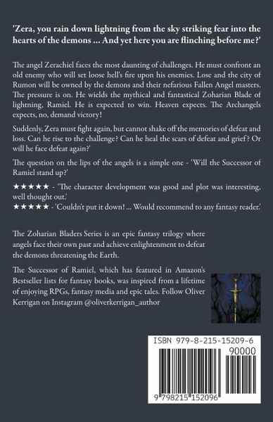 In the sacred city of Rumon, the angel Zerachiel wields the awe-inspiring Zoharian Blade of lightning, Ramiel, to vanquish demonic adversaries. Yet, when an ancient nemesis resurfaces, the fate of Rumon teeters on the brink of disaster. Zera faces an unparalleled challenge, confronting Fallen Angel overlords who threaten to unleash hell's fire upon the sacred city. Celestial expectations are high with the Archangels decreeing victory at all costs. The echoes of past defeats haunt Zera as he grapples with the spectre of profound loss. Can he rise above the scars of defeat and grief to meet this ultimate challenge? The celestial and mortal realms hold their collective breath waiting to the answer to the pivotal question - 'Will the Successor of Ramiel be victorious?' Dive into an this ever-expanding epic fantasy series that seamlessly weaves urban fantasy, action-adventure and paranormal mystery into a modern day tale of growth and enlightenment. Join the growing audience of this Amazon Best Sellers featured series and accompany Zera on his crusade battle against demons, Fallen Angels and the divine forces that want to shape his celestial destiny.