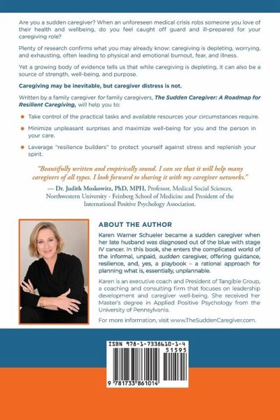 Are you a sudden caregiver? When an unforeseen medical crisis robs someone you love of their health and wellbeing, do you feel caught off guard and ill-prepared for your caregiving role? Plenty of research confirms what you may already know: caregiving is depleting, worrying, and exhausting, often leading to physical and emotional burnout, fear, and illness. Yet a growing body of evidence tells us that while caregiving is depleting, it can also be a source of strength, well-being, and purpose. Caregiving may be inevitable, but caregiver distress is not. Written by a family caregiver for family caregivers, The Sudden Caregiver: A Roadmap for Resilient Caregiving, will help you to: * Take control of the practical tasks and available resources your circumstances require. * Minimize unpleasant surprises and maximize well-being for you and the person in your care. * Leverage "resilience builders" to protect yourself against stress and replenish your spirit. "Beautifully written and empirically sound. I can see that it will help many caregivers of all types. I look forward to sharing it with my caregiver networks." - Dr. Judith Moskowitz, PhD, MPH, Professor, Medical Social Sciences, Northwestern University - Feinberg School of Medicine and President of the International Positive Psychology Association ___________________________________________________________________________________________________________________ About the Author Karen Warner Schueler became a sudden caregiver when her late husband was diagnosed out of the blue with stage IV cancer. In this book, she enters the complicated world of the informal, unpaid, sudden caregiver, offering guidance, resilience, and, yes, a roadmap - a rational approach for planning what is, essentially, unplannable. Karen is an executive coach and President of Tangible Group, a coaching and consulting firm that focuses on leadership development and caregiver well-being. She received her Master's degree in Applied Positive Psychology from the University of Pennsylvania. For more information, visit www.TheSuddenCaregiver.com.