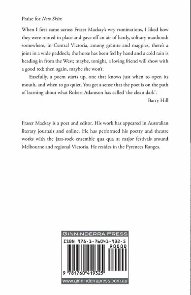 Praise for New Skin: 'When I first came across Fraser Mackay's wry ruminations, I liked how they were rooted in place and gave off an air of hardy, solitary manhood: somewhere, in Central Victoria, among granite and magpies, there's a joint in a wide paddock; the horse has been fed by hand and a cold rain is heading in from the West; maybe, tonight, a loving friend will show with a good red; then again, maybe she won't. Easefully, a poem starts up, one that knows just when to open its mouth, and when to go quiet. You get a sense that the poet is on the path of learning about what Robert Adamson has called "the clean dark".' - Barry Hill