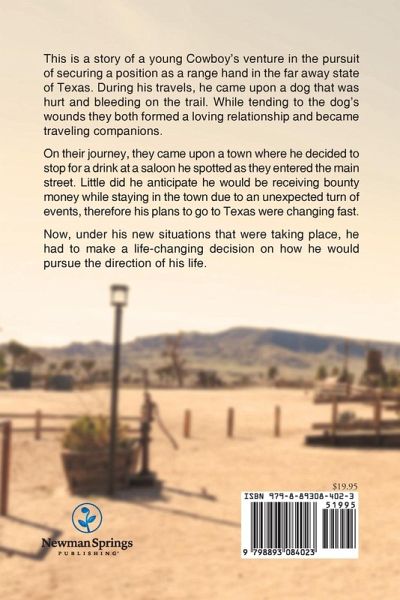 This is a story of a young Cowboy's venture in the pursuit of securing a position as a range hand in the far away state of Texas. During his travels, he came upon a dog that was hurt and bleeding on the trail. While tending to the dog's wounds they both formed a loving relationship and became traveling companions. On their journey, they came upon a town where he decided to stop for a drink at a saloon he spotted as they entered the main street. Little did he anticipate he would be receiving bounty money while staying in the town due to an unexpected turn of events, therefore his plans to go to Texas were changing fast. Now, under his new situations that were taking place, he had to make a life-changing decision on how he would pursue the direction of his life.