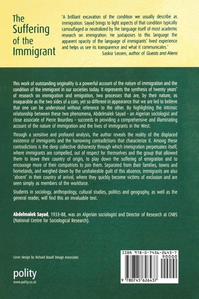 This book is a major contribution to our understanding of the condition of the immigrant and it will transform the reader's understanding of the issues surrounding immigration. Sayad's book will be widely used in courses on race, ethnicity, immigration and identity in sociology, anthropology, cultural studies, politics and geography. an outstanding and original work on the experience of immigration and the kind of suffering involved in living in a society and culture which is not one's own; describes how immigrants are compelled, out of respect for themselves and the group that allowed them to leave their country of origin, to play down the suffering of emigration; Abdelmalek Sayad, was an Algerian scholar and close associate of the French sociologist Pierre Bourdieu - after Sayad's death, Bourdieu undertook to assemble these writings for publication; this book will transform the reader's understanding of the issues surrounding immigration.