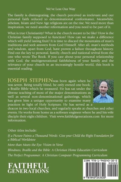 We've Lost Our Way! The family is disintegrating, the church perceived as irrelevant and our personal faith reduced to denominational conformance. Meanwhile, atheism, Islam and New Age religions are on the rise. We need more than inspiration, we need another reformation and you need to be part of it. What is true Christianity? What is the church meant to be like? How is the Christian family supposed to function? How can we make a difference which will yield lasting fruit? It is time to discard the mountains of man's traditions and seek answers from God Himself. After all, man's methods and wisdom, apart from God, have proven a failure throughout history. Find out the key to personal, family, church and national revival from the one who wrote The Book. If you care about your personal relationship with God, the multigenerational faithfulness of your family and the relevance of your church in an increasingly hostile world, this book is essential reading.