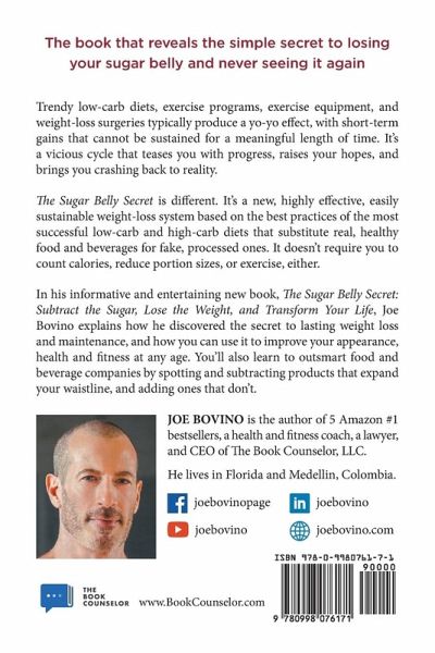 This book reveals the simple secret to losing your sugar belly and never seeing it again. Trendy low-carb diets, exercise programs, exercise equipment, and weight-loss surgeries typically produce a yo-yo effect, with short-term gains that cannot be sustained for long. It’s a vicious cycle that teases you with progress, raises your hopes, and brings you crashing back to reality. The Sugar Belly Secret is different. It’s a new, highly effective, easily sustainable weight-loss system based on the best practices of the most successful low-carb and high-carb diets that substitute real, healthy food and beverages for fake, processed ones. It doesn’t require you to count calories, reduce portion sizes, or exercise, either. In his informative and entertaining new book, The Sugar Belly Secret: Subtract the Sugar, Lose the Weight, and Transform Your Life, four-time Amazon #1 bestselling author, Joe Bovino, explains how he discovered the secret to lasting weight loss and maintenance, and how you can use it to improve your appearance, health, and fitness at any age. You’ll also learn to "outsmart" the food and beverage companies by spotting and subtracting products that expand your waistline, and adding ones that don’t.