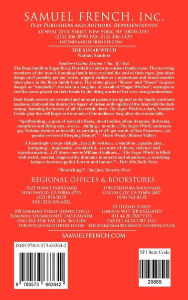 Southern Gothic Drama / 3m, 3f / Exterior The Bean family in Sugar Bean, Florida live under an ancient family curse. The surviving members of the town's founding family have reached the end of their rope. Just when things can't possibly get any worse, tragedy strikes as a mysterious and brutal murder takes place in the Bean family home. The crime places "Moses" and "Sisser" in grave danger as "Annabelle", the last in a long-line of so-called "Sugar Witches", attempts to end the curse placed on t