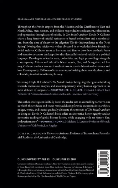 Throughout the French empire, from the Atlantic and the Caribbean to West and North Africa, men, women, and children responded to enslavement, colonization, and oppression through acts of suicide. In The Suicide Archive, Doyle D. Calhoun charts a long history of suicidal resistance to French colonialism and neocolonialism, from the time of slavery to the Algerian War for Independence to the "Arab Spring." Noting that suicide was either obscured in or occluded from French colonial archives, Calhoun turns to literature and film to show how aesthetic forms and narrative accounts can keep alive the silenced histories of suicide as a political language. Drawing on scientific texts, police files, and legal proceedings alongside contemporary African and Afro-Caribbean novels, film, and Senegalese oral history, Calhoun outlines how such aesthetic works rewrite histories of resistance and loss. Consequently, Calhoun offers a new way of writing about suicide, slavery, and coloniality in relation to literary history.
