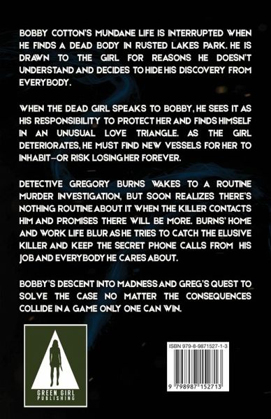 Bobby Cotton's mundane life is interrupted when he finds a dead body in Rusted Lakes Park. He is drawn to the girl for reasons he doesn't understand and decides to hide his discovery from everybody. When the dead girl speaks to Bobby, he sees it as his responsibility to protect her and finds himself in an unusual love triangle. As the girl deteriorates, he must find new vessels for her to inhabit-or risk losing her forever. Detective Gregory Burns wakes to a routine murder investigation, but soon realizes there's nothing routine about it when the killer contacts him and promises there will be more. Burns' home and work life blur as he tries to catch the elusive killer and keep the secret phone calls from his job and everybody he cares about. Bobby's descent into madness and Greg's quest to solve the case no matter the consequences collide in a game only one can win.