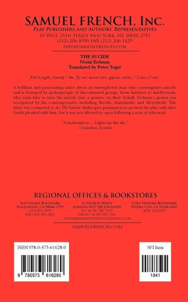 Full Length, Comedy Characters: 9 male, 5 female, plus various minor roles, gypsies, and extras. 2 Interior Sets/2 Exterior Sets A brilliant and penetrating satire about an unemployed man who contemplates suicide and is besieged by spokespeople of discontented groups, from butchers to intellectuals, who want him to turn his suicide into a gesture on their behalf. Erdman's genius was recognized by his contemporaries including Brecht, Stanislavsky and Meyerhold. The latter two competed to do The Suicide. Stalin gave permission to present the play only after Gorki pleaded with him, but it was not allowed to open following a year of rehearsal. "A masterpiece.... Lights up the sky." Guardian, London