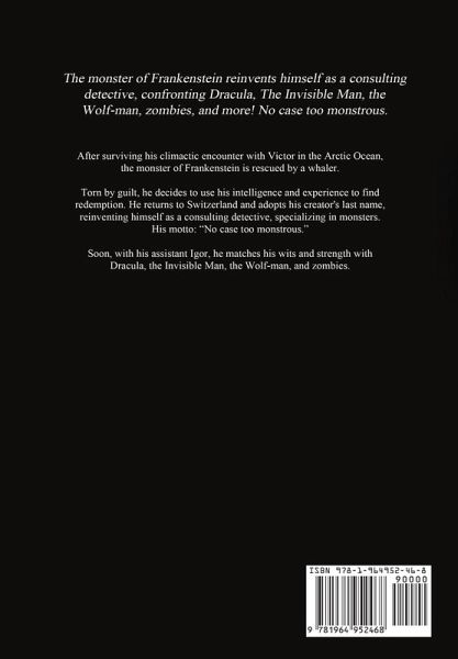 The monster of Frankenstein reinvents himself as a consulting detective, confronting Dracula, The Invisible Man, the Wolf-man, zombies and more! No case too monstrous. After surviving his climactic encounter with Victor in the Arctic Ocean, the monster of Frankenstein is rescued by a whaler. Torn by guilt, he decides to use his intelligence and experience to find redemption. He returns to Switzerland and adopts his creator's last name, reinventing himself as a consulting detective, specializing in monsters. His motto: "No case too monstrous." Soon, with his assistant Igor, he matches his wits and strength with Dracula, the Invisible Man, the Wolf-man, and zombies.