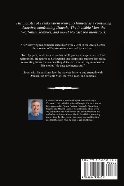 The monster of Frankenstein reinvents himself as a consulting detective, confronting Dracula, The Invisible Man, the Wolf-man, zombies and more! No case too monstrous. After surviving his climactic encounter with Victor in the Arctic Ocean, the monster of Frankenstein is rescued by a whaler. Torn by guilt, he decides to use his intelligence and experience to find redemption. He returns to Switzerland and adopts his creator's last name, reinventing himself as a consulting detective, specializing in monsters. His motto: "No case too monstrous." Soon, with his assistant Igor, he matches his wits and strength with Dracula, the Invisible Man, the Wolf-man, and zombies.