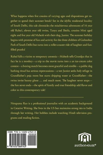 What happens when five cousins of varying ages and dispositions get together to spend their summer break? Set in the idyllic residential locality of South Delhi, this tale chronicles the mischievous adventures of 14 year old Rahu1, eleven year old twins, Tanya and Sheila, cousins Mini aged eight and five year old Mahesh with their dog, Junior. The summer holiday begins with promise of fun and activity for the three children of Gulmohur Park of South Delhi but turns into a roller-coaster ride of laughter and fun-filled pranks! Rahul falls a victim to temporary amnesia-Mahesh tells Grandpa that in fact he is a monkey- a trip to the movie turns into a an ice-cream color contest- a boxing match becomes more graceful and nimble-a public dog bathing ritual has serious repercussions-- a wet Junior seeks holy refuge in Granfather's puja room but starts dripping water at Grandfather-the twins invite bunny ghost ... and much more. The laughter never stops-the fun never ends-the spirit of family and true friendship add flavor and color to this contemporary tale!