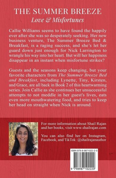 Callie Williams seems to have found the happily ever after she was so desperately seeking. Her new business venture, The Summer Breeze Bed & Breakfast, is a raging success, and she's let her guard down just enough for Nick Larrington to wrangle his way into her heart. But will her happiness disappear in an instant when misfortune strikes? Guests and the seasons keep changing, but your favorite characters from The Summer Breeze Bed and Breakfast, including Lynette, Tiny, Kirsten, and Grace, are all back in Book 2 of this heartwarming series. Join Callie as she continues her unsuccessful attempts to not meddle in her guest's lives, eats even more mouthwatering food, and tries to keep her head on straight when Nick is around.