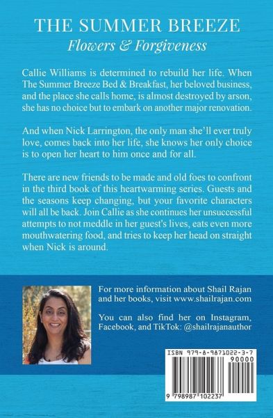 Callie Williams is determined to rebuild her life after almost losing her home to arson and the man she loved to fear. But will she truly be able to forgive the wrongs of the past? Callie Williams is determined to rebuild her life. When The Summer Breeze Bed & Breakfast, her beloved business, and the place she calls home, is almost destroyed by arson, she has no choice but to embark on another major renovation. And when Nick Larrington, the only man she'll ever truly love, reenters her life, she knows that her only choice is to open her heart to him once and for all. There are new friends to be made and old foes to confront in the third book of this heartwarming series. Guests and the seasons keep changing, but your favorite characters will all be back. Join Callie as she continues her unsuccessful attempts to not meddle in her guest's lives, eats even more mouthwatering food, and tries to keep her head on straight when Nick is around.