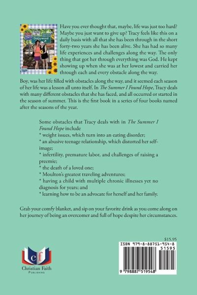 Have you ever thought that, maybe, life was just too hard? Maybe you just want to give up? Tracy feels like this on a daily basis with all that she has been through in the short forty-two years she has been alive. She has had so many life experiences and challenges along the way. The only thing that got her through everything was God. He kept showing up when she was at her lowest and carried her through each and every obstacle along the way. Boy, was her life filled with obstacles along the way, and it seemed each season of her life was a lesson all unto itself. In The Summer I Found Hope, Tracy deals with many different obstacles that she has faced, and all occurred or started in the season of summer. This is the first book in a series of four books named after the seasons of the year. Some obstacles that Tracy deals with in The Summer I Found Hope include * weight issues, which turn into an eating disorder; * an abusive teenage relationship, which distorted her self-image; * infertility, premature labor, and challenges of raising a preemie; * the death of a loved one; * Moulton's greatest traveling adventures; * having a child with multiple chronic illnesses yet no diagnosis for years; and * learning how to be an advocate for herself and her family. Grab your comfy blanket, and sip on your favorite drink as you come along on her journey of being an overcomer and full of hope despite her circumstances.