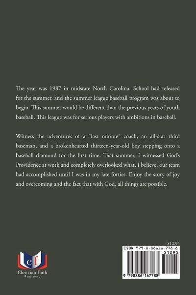 The year was 1987 in midstate North Carolina. School had released for the summer, and the summer league baseball program was about to begin. This summer would be different than the previous years of youth baseball. This league was for serious players with ambitions in baseball. Witness the adventures of a "last minute" coach, an all-star third baseman, and a brokenhearted thirteen-year-old boy stepping onto a baseball diamond for the first time. That summer, I witnessed God's Providence at work and completely overlooked what, I believe, our team had accomplished until I was in my late forties. Enjoy the story of joy and overcoming and the fact that with God, all things are possible.