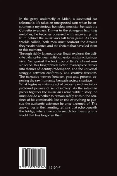 In the gritty underbelly of Milan, a successful car salesman's life takes an unexpected turn when he encounters a mysterious homeless musician beneath the Corvetto overpass. Drawn to the stranger's haunting melodies, he becomes obsessed with uncovering the truth behind the musician's fall from grace. As their worlds collide, both men must confront the dreams they've abandoned and the choices that have led them to this moment.Through richly layered prose, Buzzi explores the delicate balance between artistic passion and practical survival. Set against the backdrop of Italy's vibrant music scene, this biographical fiction masterpiece delves into themes of identity, redemption, and the universal struggle between conformity and creative freedom. The narrative weaves between past and present, exposing the raw humanity beneath society's surface.What begins as a simple act of curiosity evolves into a profound journey of self-discovery. As the salesman pieces together the musician's remarkable history, he must decide whether to remain safely within the confines of his comfortable life or risk everything to pursue the authentic existence he once dreamed of. The answer lies in the haunting refrains that echo beneath the bridge, where two souls search for meaning in a world that has forgotten them.