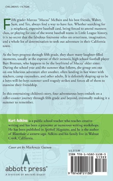 Fifth grader Marcus "Mucus" McBain and his best friends, Walter, Sam, and Tex, always find a way to have fun. Whether searching for a misplaced, expensive baseball card, being forced to attend manners class, or playing for one of the worst baseball teams in Little League history, it is no secret that the fabulous foursome relies on orneriness, imagination, and a whole lot of determination to seek out adventure in their California town. As the boys progress through fifth grade, they share many laughter-filled moments, usually at the expense of their nemesis, high school football player Bart Broznan, who happens to be the boyfriend of Mucus' older sister. During the school year and the summer that follows, the group sets out on one hilarious adventure after another, often landing in hot water with teachers, camp counselors, and other adults. It is definitely shaping up to be a boys-will-be-boys summer until tragedy strikes and forces all of them to examine their friendship. In this entertaining children's story, four adventurous boys embark on a roller-coaster journey through fifth grade and beyond, eventually making it a summer to remember.