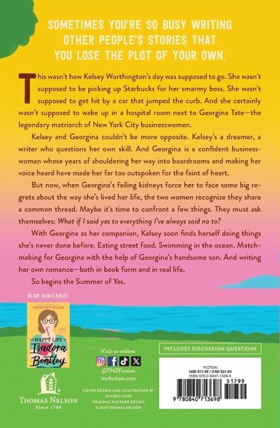 Sometimes you're so busy writing other people's stories that you lose the plot of your own. Full of heart, joy, and hope, The Summer of Yes features an unlikely female friendship, one crazy road trip, a bookish protagonist, and a slow-burn, kisses only romance. Perfect for fans of Rachel Linden and Annabel Monaghan.