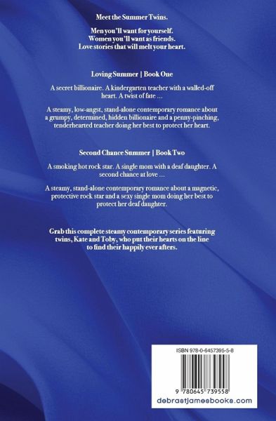 Meet the Summer Twins. Men you'll want for yourself. Women you'll want as friends. Love stories that will melt your heart. Loving Summer Book One A secret billionaire. A kindergarten teacher with a walled-off heart. A twist of fate ... A steamy, low-angst, stand-alone contemporary romance about a grumpy, determined, hidden billionaire and a penny-pinching, tenderhearted teacher doing her best to protect her heart. Second Chance Summer Book Two A smoking hot rock star. A single mom with a deaf daughter. A second chance at love ... A steamy, stand-alone contemporary romance about a magnetic, protective rock star and a sexy single mom doing her best to protect her deaf daughter. Grab this complete steamy contemporary series featuring twins, Kate and Toby, who put their hearts on the line to find their happily ever afters.