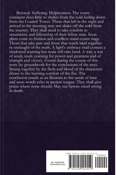 Betrayal. Suffering. Helplessness. The warm continent does little to shelter from the cold feeling down from the Council Tower. Those that left in the night and arrived in the morning may not shake off the cold from the journey. They shall need to take comfort in uncertainty and fellowship of their fellow man. Soon plans come to fruition and conflicts stand center stage. Those that take part and those that watch bind together in onslaught of the truth. A light's embrace shall contain a shadowed warning but none will take heed. A war, a war of souls, souls yearning for power and greatness and of triumph and victory. Events during the course of this story lay groundwork for the conclusions of the next. Strung together by the flesh and blood of the characters drawn to the burning comfort of the fire. The conclusion stands as an illusions to the sands of time and soon words echo in ancient tongue. They shall give praise where none should. May our heroes stand strong in death.