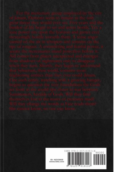 For the mercenary group employed by the city of Jenaut, Demons seem to remain as the only great threat they would ever see. Five years and the burden of life begin to set and stress bonds. Yet, a lone power sits upon the horizon and grows ever increasingly hostile towards them. A tense anger carried on the air in whispers and remains on the tips of tongues. A constricting and fearful power, it seems the mercenaries stand powerless before it. Aid comes from places unexpected and emerges from shadows of nightmares only to disappear when they turn. Shortly, they begin to understand that Sylsteruin, their world, contains more frightening entities than they ever could dream. One such entity, watching with a growing hunger, begins to question the very foundations the Gods set forth as the world tips closer to war between Summoners, heralds of Gods. Will they find themselves lost in the maws of creatures mad? Will they change the words as Fate reads them? She cannot know, no one can know.