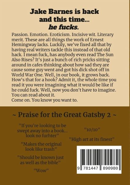 Jake Barnes is back and this time... he fucks. Passion. Emotion. Eroticism. Incisive wit. Literary merit. These are all the things the work of Ernest Hemingway lacks. Luckily, we've fixed all that by having real writers tackle this instead of that old hack. I mean fuck, has anybody even read The Sun Also Rises? It's just a bunch of rich pricks sitting around in cafes thinking about how sad they are cause some guy went and got his dick shot off in World War One. Well, in our book, it grows back. How's that for a hook? Admit it, the whole time you read it you were imagining what it would be like if he could fuck. Well, now you don't have to imagine. You can read about it. Come on. You know you want to. ~PRAISE FOR THE GREAT GATSBY 2~ "10/10" "If you're looking to be swept away into a book... look no further" "High art at its finest" "Should be known just as well as the bible" "Makes the original look like trash" "Wow."
