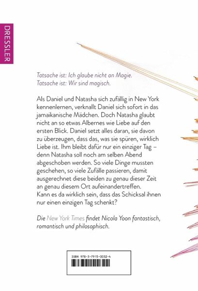 Nicola Yoons Roman ist eine moderne Liebesgeschichte, die sich mit Themen wie Identität, Familie, Einwanderung und dem Schicksal auseinandersetzt. Die Geschichte wird durch abwechslungsreiche Erzählstile, einschließlich kurzer Kapitel aus verschiedenen Perspektiven, angereichert und bietet dadurch einzigartige Einblicke in die Leben und Hintergründe der Charaktere. Durch die Verwendung von E-Mails, Listen und grafischen Darstellungen wird die Geschichte visuell und emotional ansprechend erzählt. Die Beziehung zwischen Daniel und Natasha zeigt, wie zwei Menschen aus unterschiedlichen Welten in der Lage sein können, sich über kulturelle und persönliche Grenzen hinweg zu verbinden und einander zu beeinflussen.