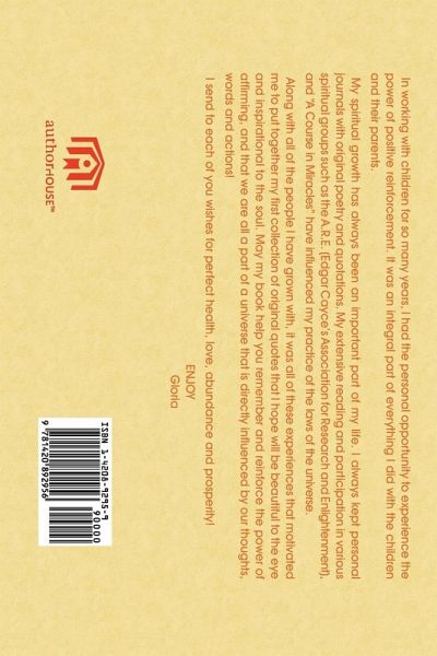 In working with children for so many years, I had the personal opportunity to experience the power of positive reinforcement. It was an integral part of everything I did with the children and their parents. My spiritual growth has always been an important part of my life. I always kept personal journals with original poetry and quotations. My extensive reading and participation in various spiritual groups such as the A.R.E. (Edgar Cayce''s Association for Research and Enlightenment), and "A Course in Miracles" have influenced my practice of the laws of the universe. Along with all of the people I have grown with, it was all of these experiences that motivated me to put together my first collection of original quotes that I hope will be beautiful to the eye and inspirational to the soul. May my book help you remember and reinforce the power of affirming, and that we are all a part of a universe that is directly influenced by our thoughts, words and actions! I send to each of you wishes for perfect health, love, abundance and prosperity! ENJOY Gloria