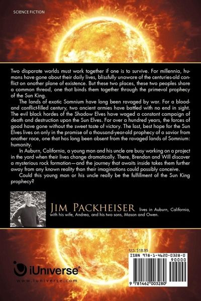 Two disparate worlds must work together if one is to survive. For millennia, humans have gone about their daily lives, blissfully unaware of the centuries-old conflict on another plane of existence. But these two places, these two peoples share a common thread, one that binds them together through the primeval prophecy of the Sun King. The lands of exotic Somnium have long been ravaged by war. For a blood-and conflict-filled century, two ancient armies have battled with no end in sight. The evil black hordes of the Shadow Elves have waged a constant campaign of death and destruction upon the Sun Elves. For over a hundred years, the forces of good have gone without the sweet taste of victory. The last, best hope for the Sun Elves lives on only in the promise of a thousand-year-old prophecy of a savior from another race, one that has long been absent from the ravaged lands of Somnium: humanity. In Auburn, California, a young man and his uncle are busy working on a project in the yard when their lives change dramatically. There, Brendan and Will discover a mysterious rock formation-and the journey that awaits inside takes them further away from any known reality than their imaginations could possibly conceive. Could this young man or his uncle really be the fulfillment of the Sun King prophecy?