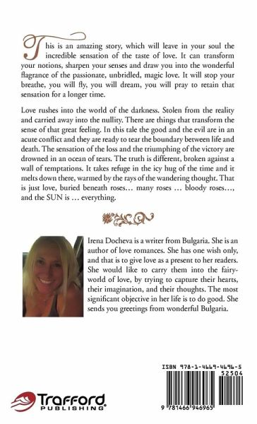 This is an amazing story, which will leave in your soul the incredible sensation of the taste of love. It can transform your notions, sharpen your senses and draw you into the wonderful flagrance of the passionate, unbridled, magic love. It will stop your breath. You will fly, you will dream, you will pray to retain that sensation for a longer time. Love rushes into the world of the darkness. Stolen from the reality and carried away into the nullity. There are things that transform the sense of that great feeling. In this tale, the good and the evil are in an acute conflict, and they are ready to tear the boundary between life and death. The sensation of the loss and the triumphing of the victory are drowned in an ocean of tears. The truth is different, broken against a wall of temptations. It takes refuge in the icy hug of the time, and it melts down there, warmed by the rays of the wandering thought. That is just love, buried beneath roses . . . many roses . . . bloody roses . . . , and the sun is . . . everything.